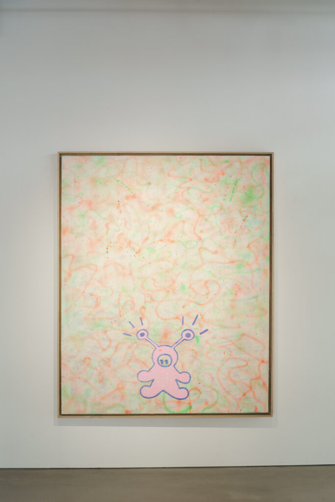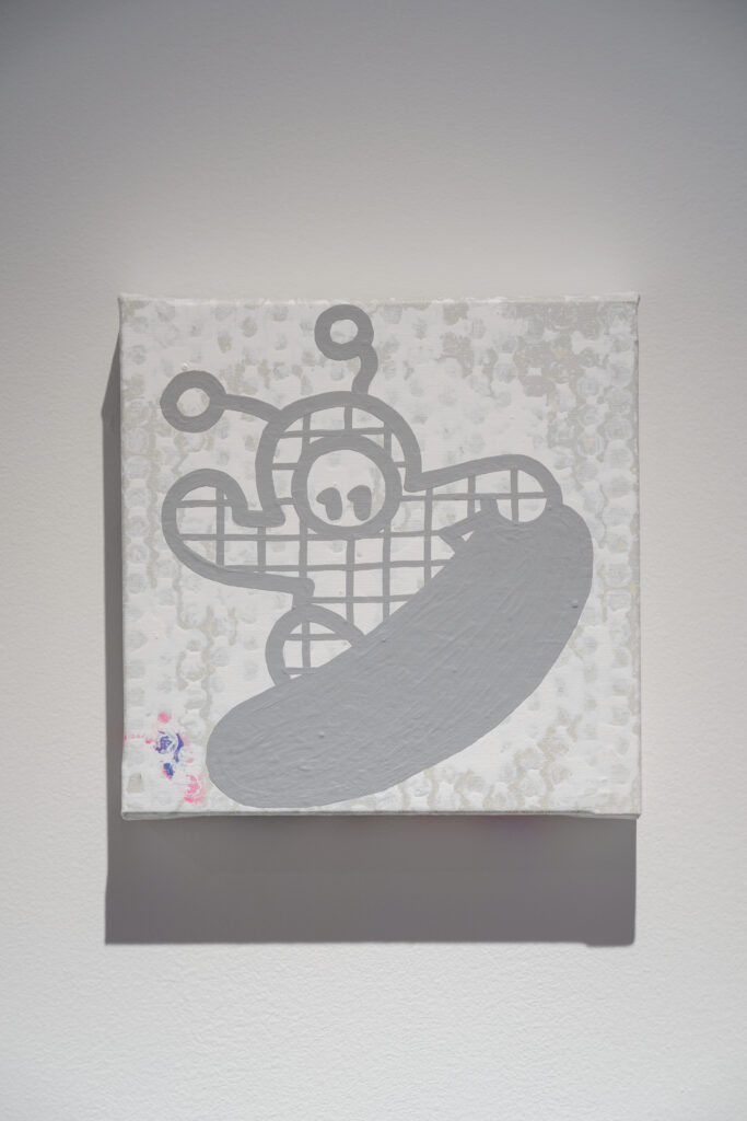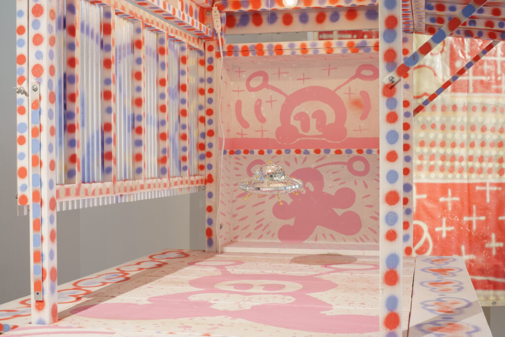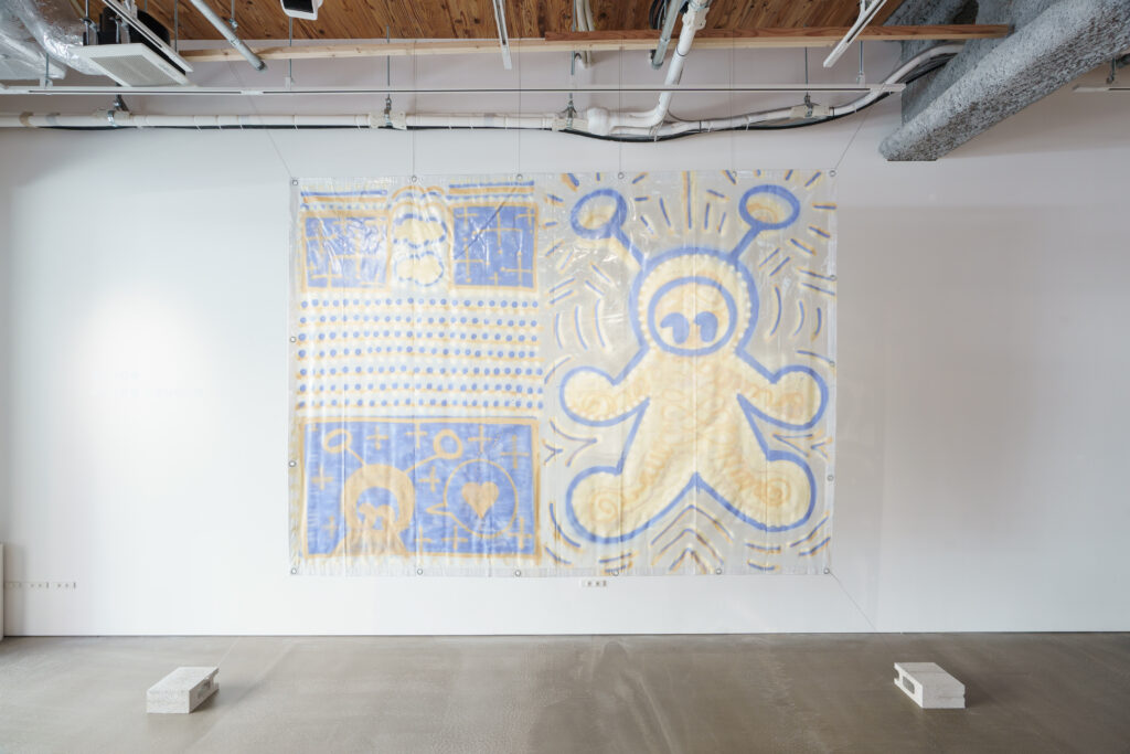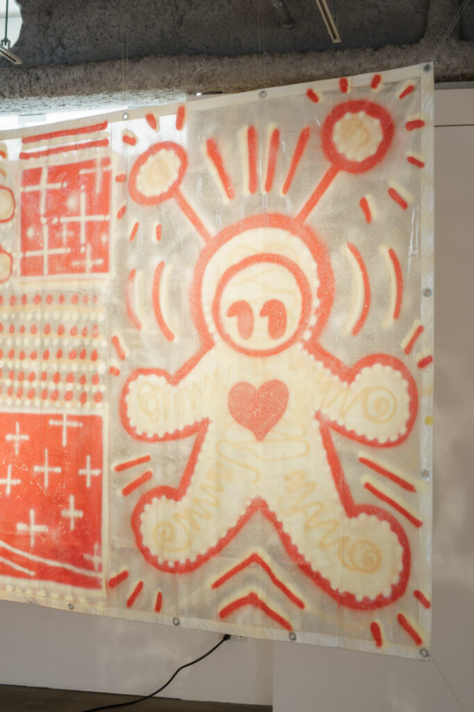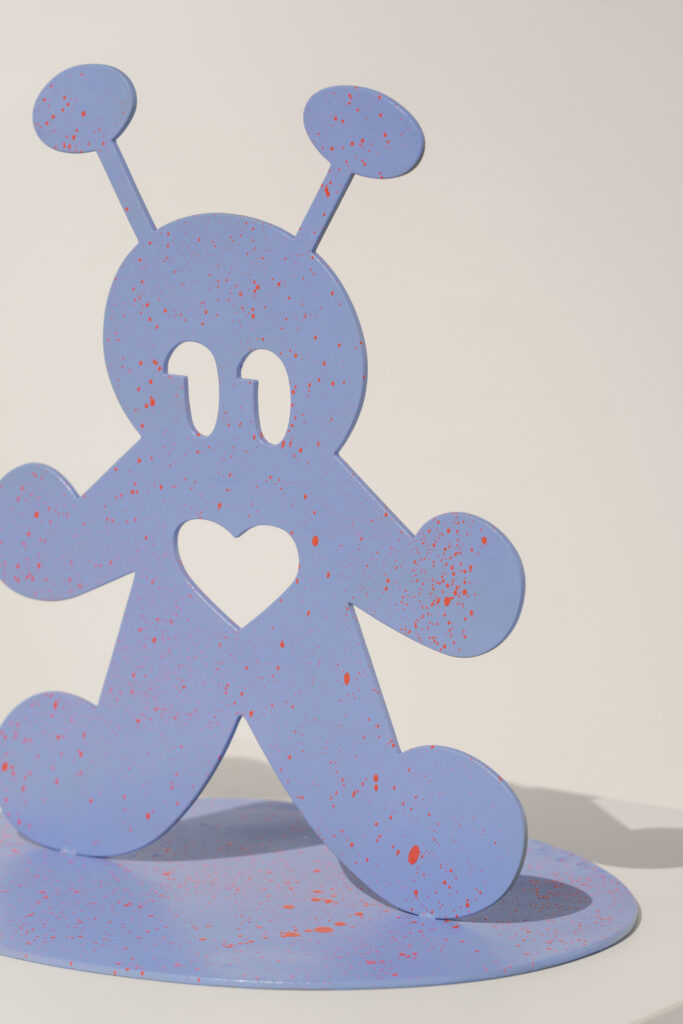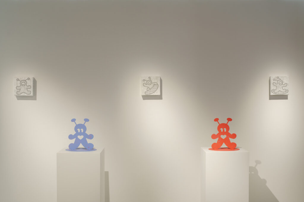 平面的なようで立体的な作品になっています。目とハートの穴は、鑑賞者の視点を切り取るフレームをイメージしています。たとえば、僕は雨があんまり好きじゃないんですけど、「エイリアンちゃん」を通して見たら悪くないなと思えたり。「癒やし」を生むフィルターのようなものとして、こうした作品を作りました。
