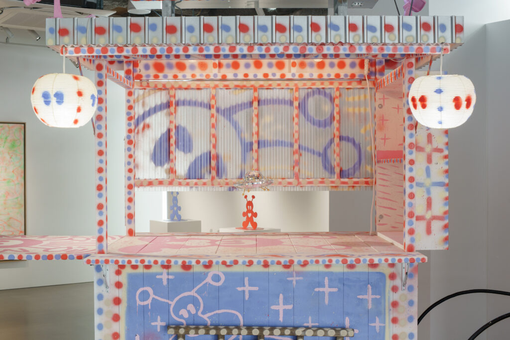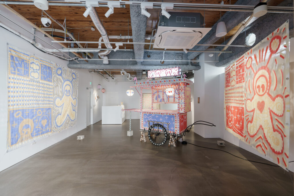 ――2つのターポリンの作品も180×250cmと大きく、屋台を挟む形で展示されていますね。空間構成について、どのようなお考えがあったのでしょうか?