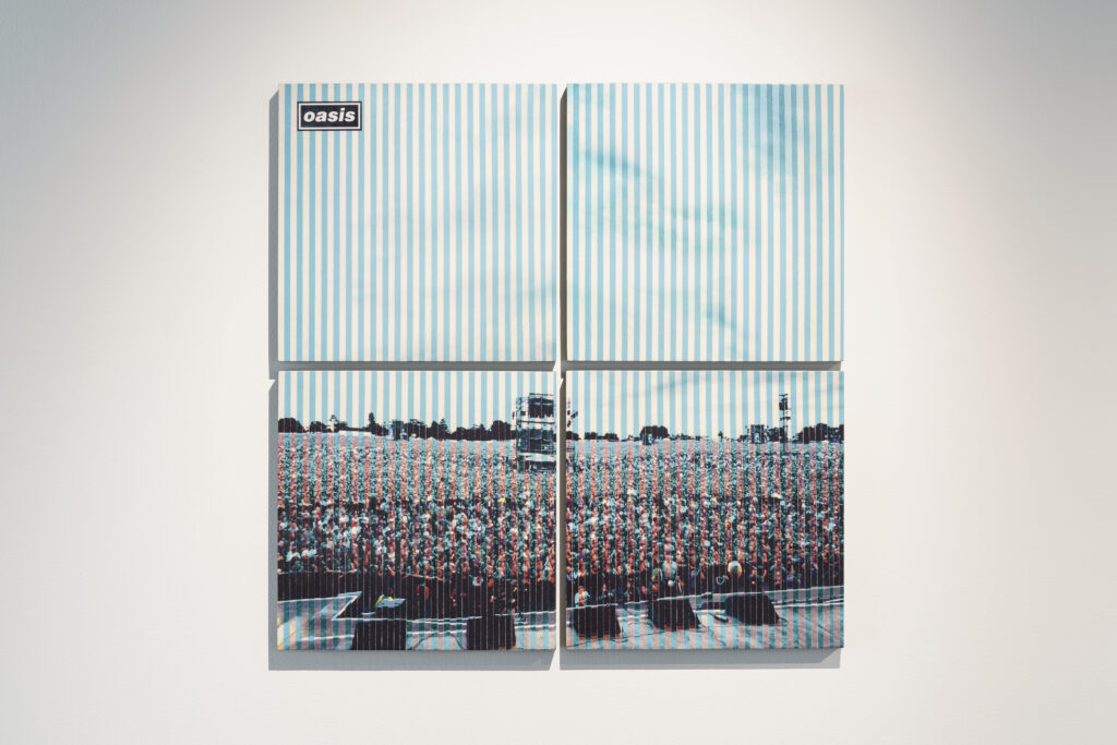 一連の記録写真に加えて展示される、ポートレートやロゴ、ジャケットを大胆に再構築したコラージュ作品を制作したのは、『AKIRA』アートウォールプロジェクトなどでも知られるポップアーティストの河村康輔。シュレッダーで裁断した素材を手作業で貼り合わせる河村独自の手法により、オアシスの新たなイメージや歴史が立ちあらわれてくる。